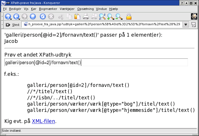 "galleri/person[@id=2]/fornavn/text()" anvendt på ovenstående XML-fil persongalleri.xml vil det finde <galleri>-indgangen, under denne finde <person>-indgangen med attributten id=2 og under den finde <fornavn>-indgangens tekst, d.v.s. strengen:
