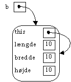 rumfang = boksobjekt.volumen();Her får det Boks-objekt, som boksobjekt refererer til, sat sine variabler, og når metoden volumen() derefter kaldes på dette objekt, vil længde, bredde og højde have disse værdier. rumfang bliver sat til den værdi, vol har i return-linien, og vol nedlægges (da den er en lokal variabel).