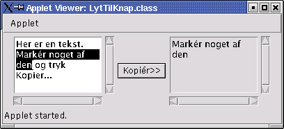 Det vigtigste interface til programmering af grafiske brugergrænseflader er ActionListener med metoden actionPerformed(). Den bruges bl.a. til at lytte til, om knapper bliver trykket på. Her er et eksempel, hvor den tekst, der er valgt med musen i et tekstområde, bliver kopieret til det andet tekstområde, når man trykker på knappen.