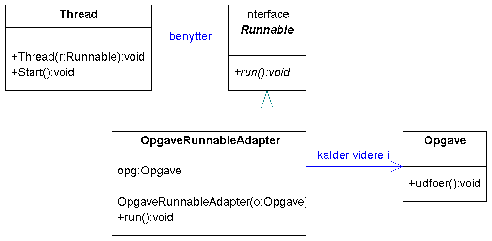 Nu kunne vi selvfølgelig ændre klassen Opgave, så den implementerede Runnable, men vi kunne også vælge at lave en Adapter, der får Opgave til at passe ind i Runnable:
