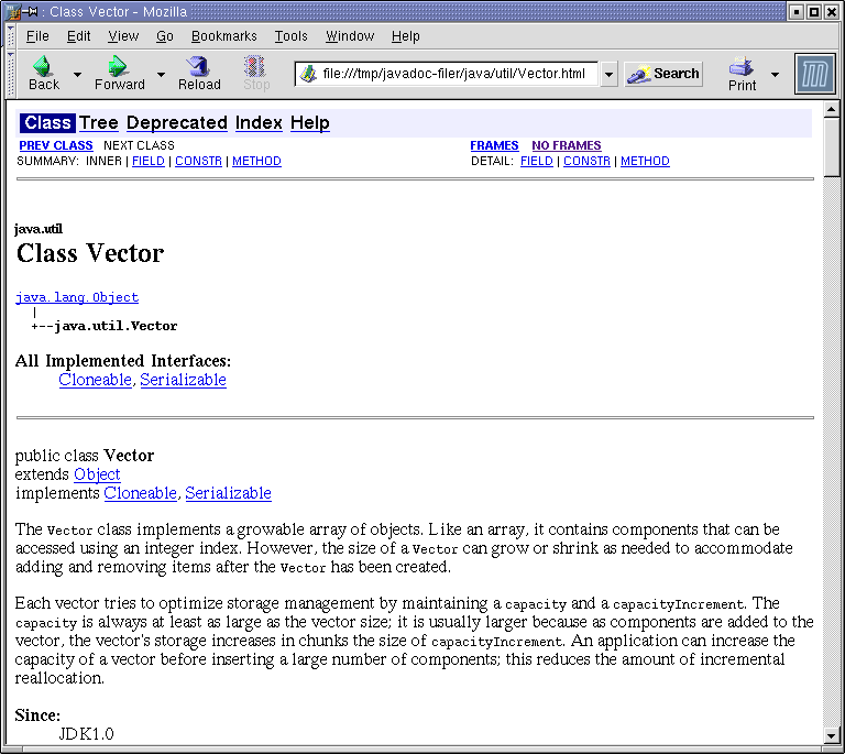 Fortsætter vi i kildeteksten til Vector (der findes samlet i afsnit 1.6.8), kan vi se, hvordan javadoc genererer HTML-kode (vist til højre) ud fra beskrivelsen af metoderne og specielle javadoc-koder (beskrevet i afsnit 2.3.2) som @param, @return, @exception, @since og @see:
